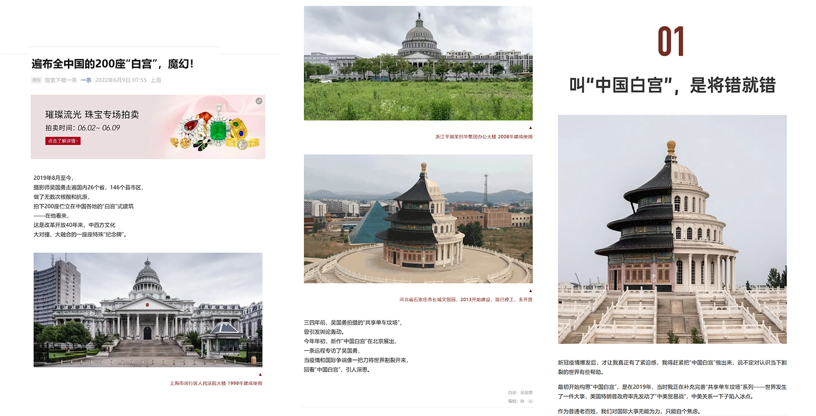 很显然,此时“白宫”已演变成了一个符号,承载了人们对于法治理想、权力想象、文化向往以及财富渴望等诸多复杂而微妙的情感,构成“白宫”意象的万花筒,是一个既包容吸纳、又缺乏主体性和文化认知的文化现象。由这种意象再具象成矗立在中国各地的一座座“白宫”式建筑,就成了中国改革开放以来中西方文化大碰撞大融合的一个个实证。从这个角度说,它们就是改开时代遗存的一座座“纪念碑”。
