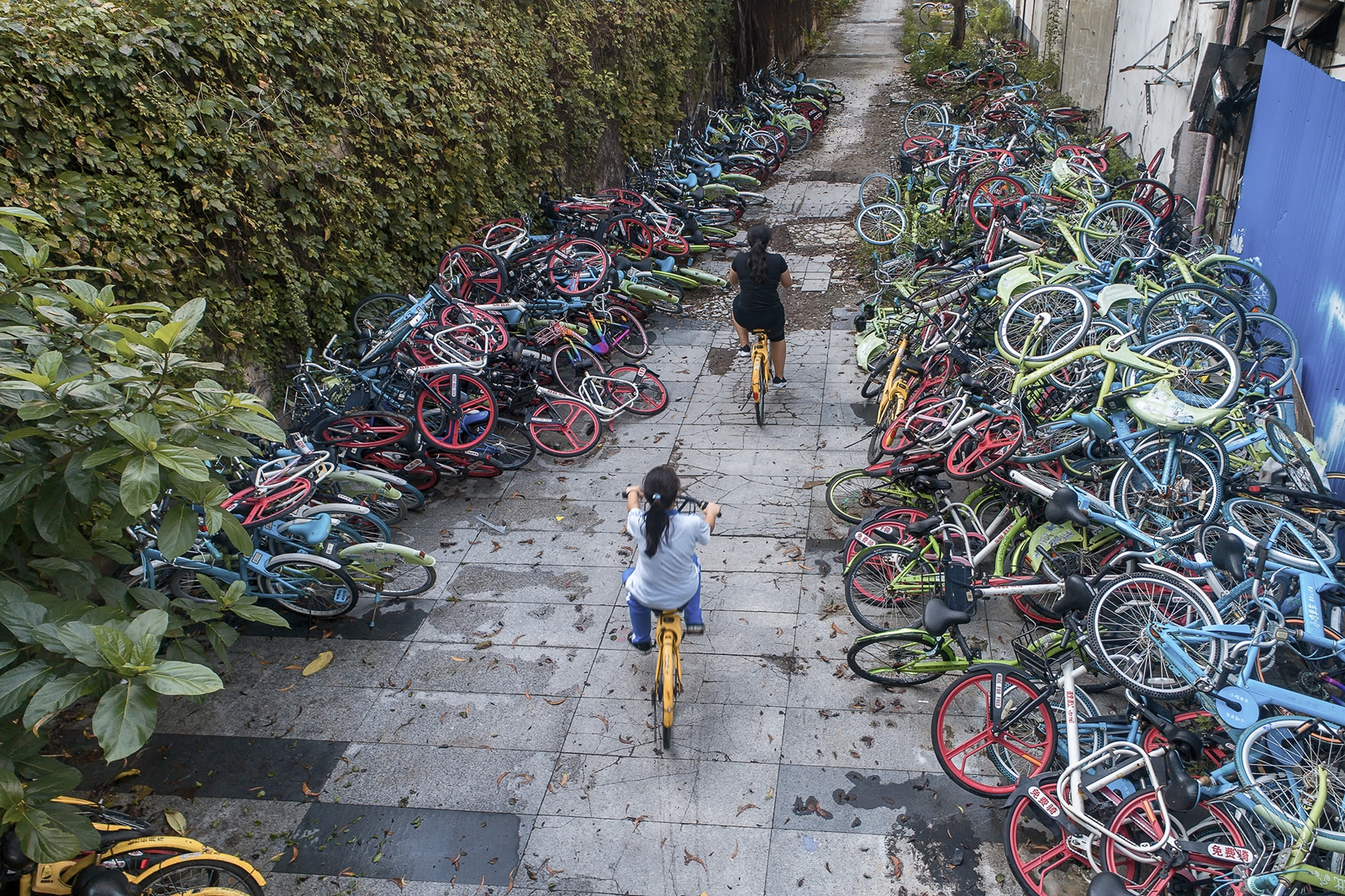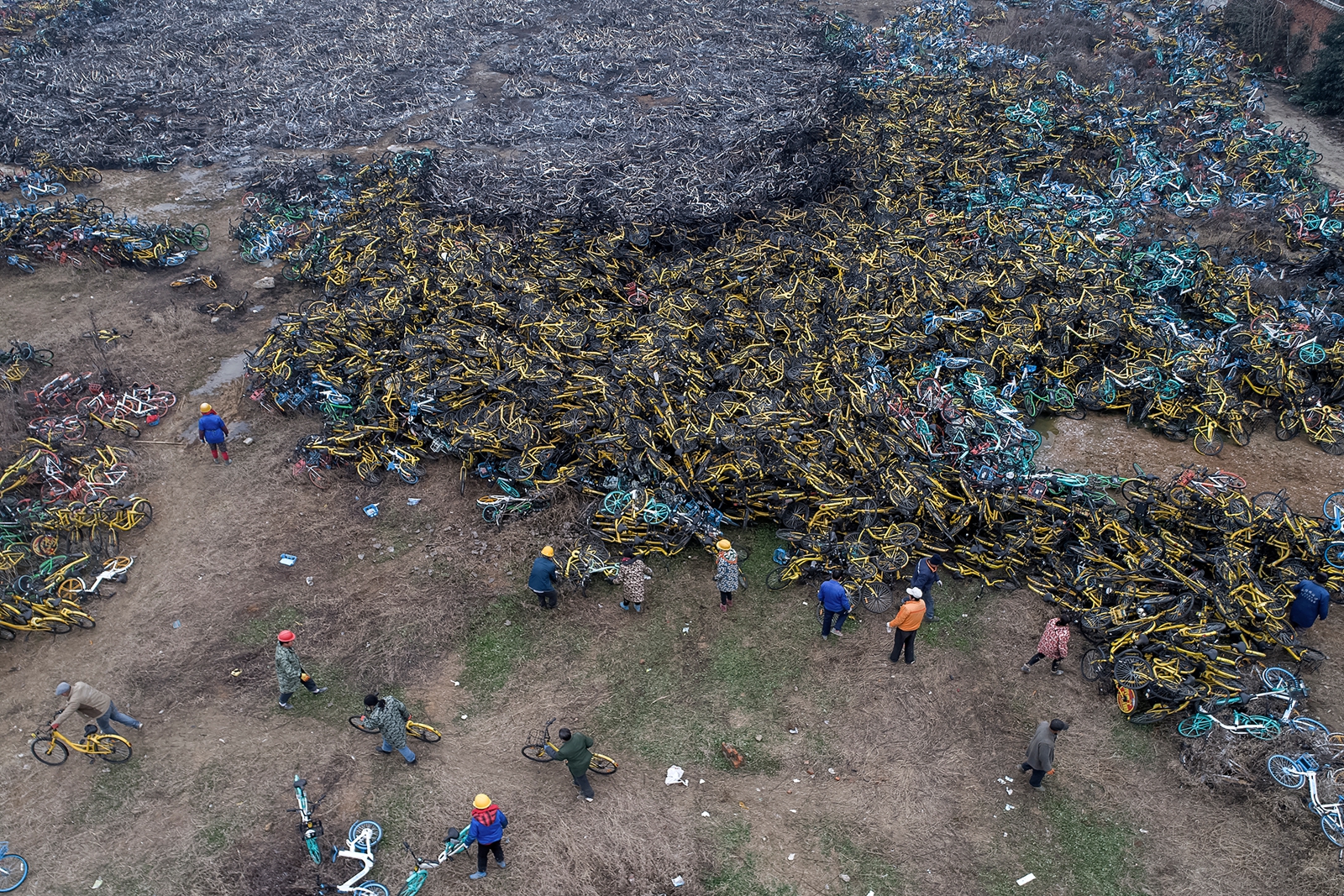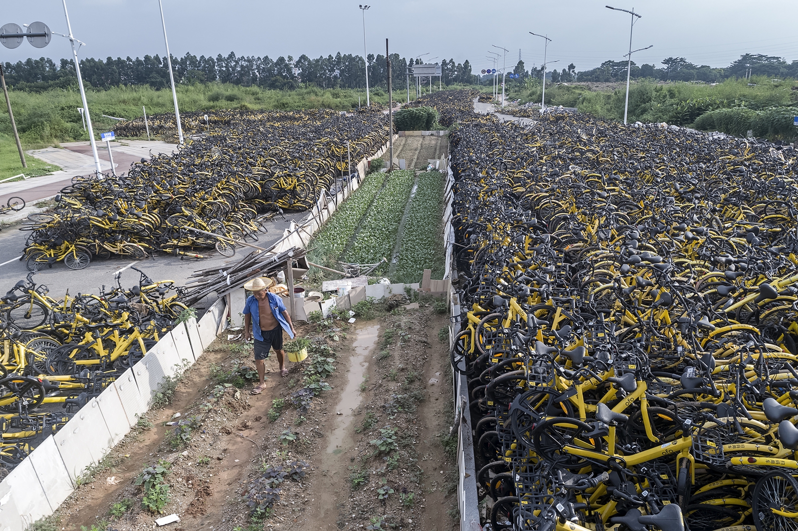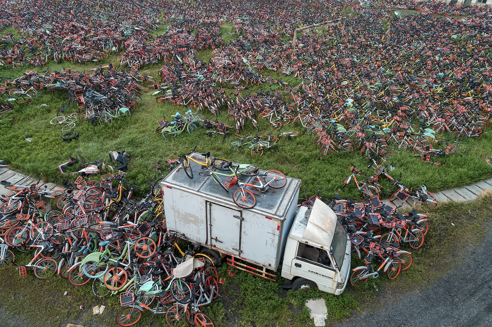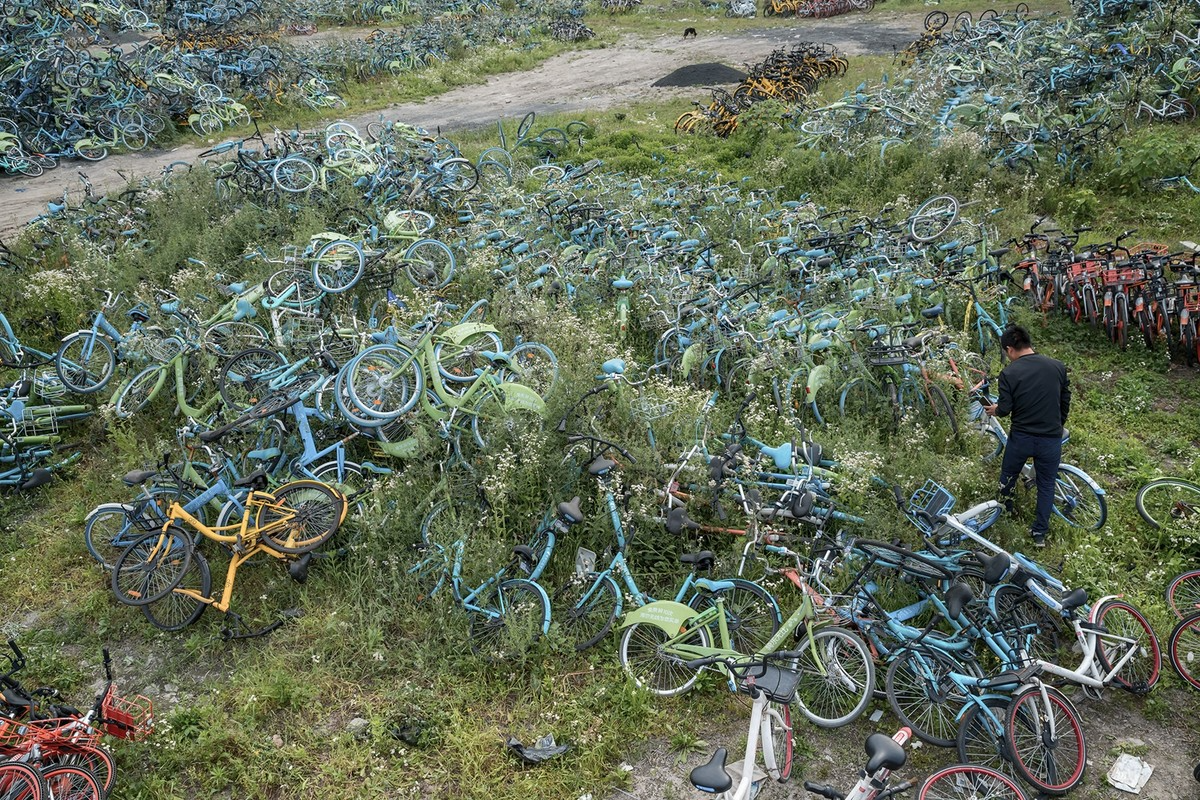 从一开始的放任不管,到2017年中期车多为患时,政府才觉不妙,开始实施限制管理,并由政府主导对市场上超量投放的单车进行收缴清理。这些被清理的临时堆车点在中国各大城市纷纷出现,体量庞大却又隐蔽难寻,被人们称为共享单车“坟场”。共享单车运营商因此纷纷倒闭,仅剩少数几家公司勉力运营。数十亿元人民币的用户押金无法退还,数百亿资本财富打造的共享单车弃如敝履,成了城市垃圾。