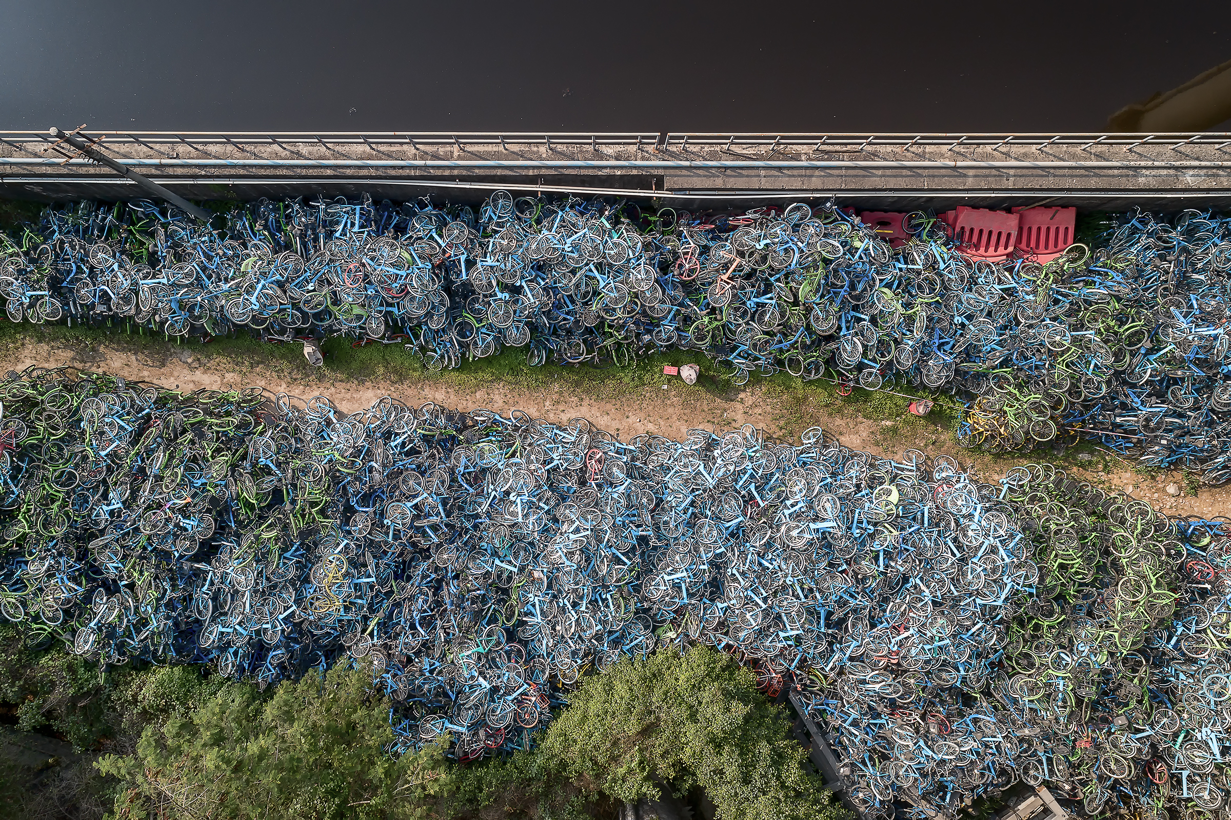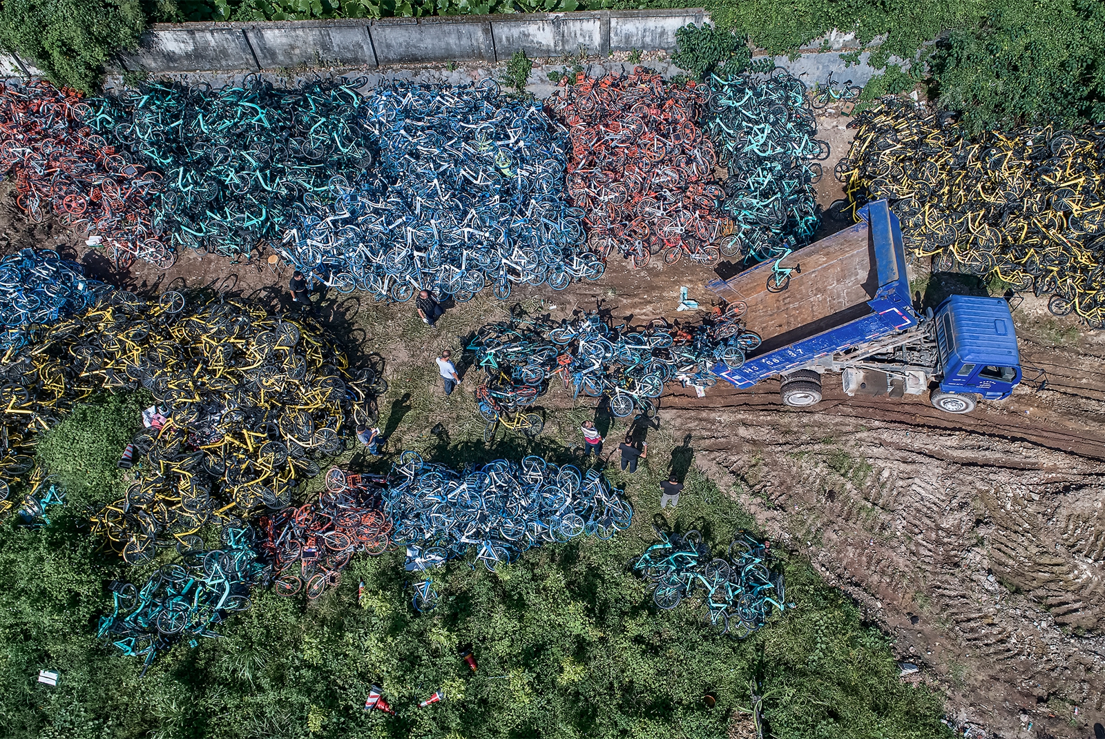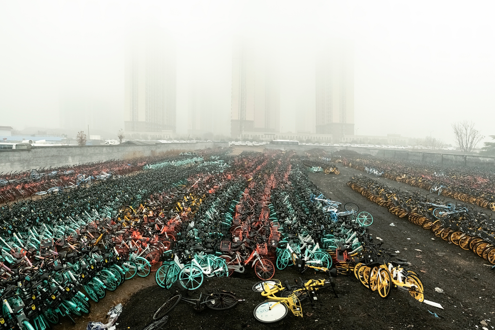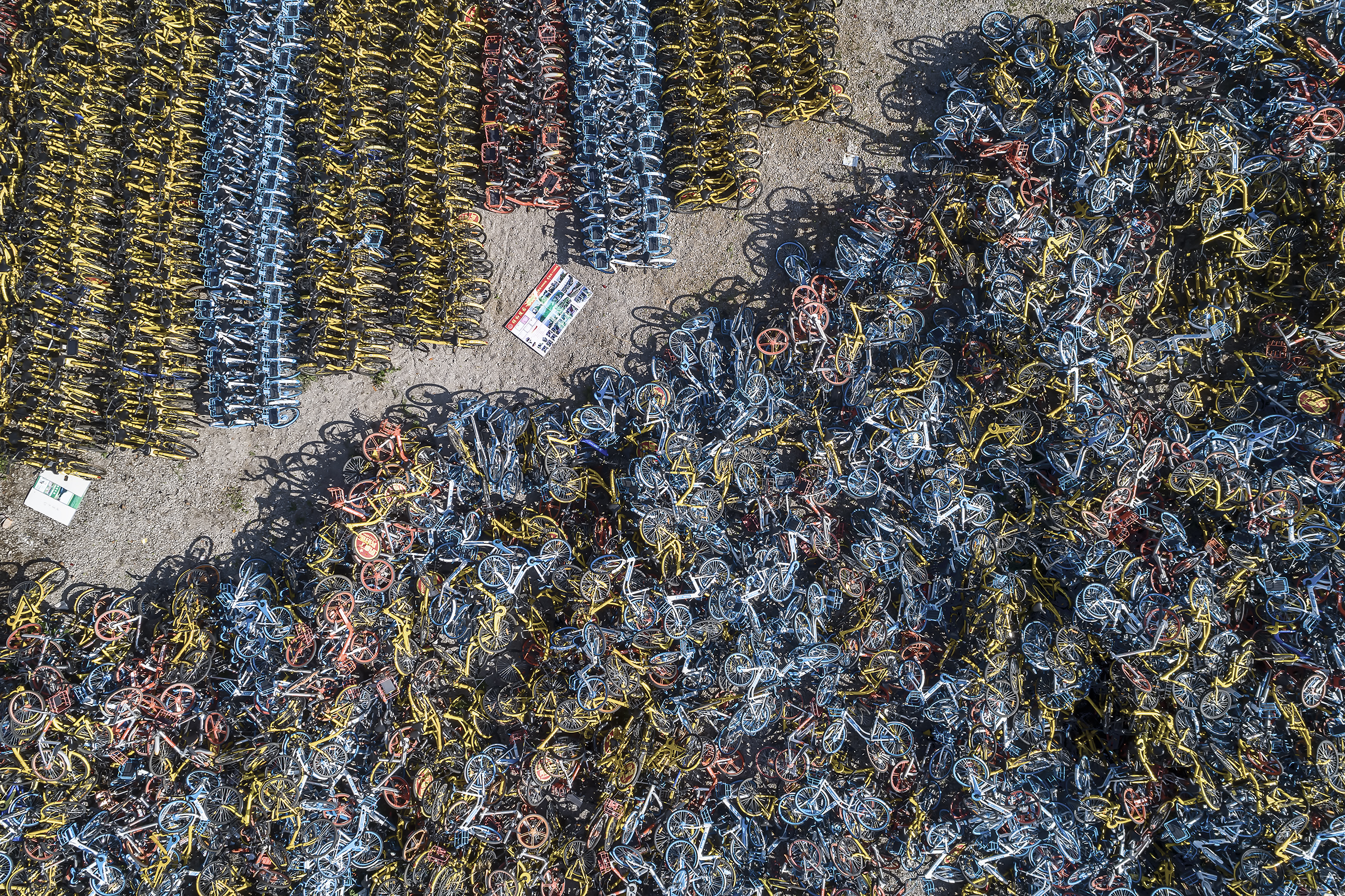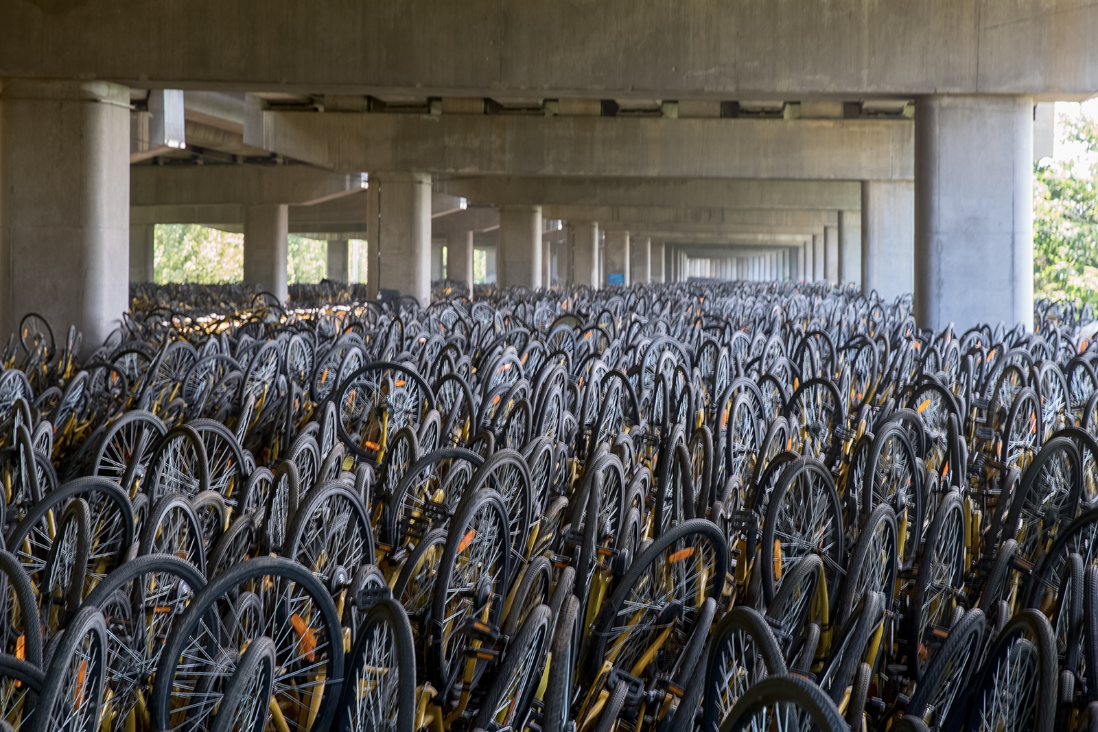 从一开始的放任不管,到2017年中期车多为患时,政府才觉不妙,开始实施限制管理,并由政府主导对市场上超量投放的单车进行收缴清理。这些被清理的临时堆车点在中国各大城市纷纷出现,体量庞大却又隐蔽难寻,被人们称为共享单车“坟场”。共享单车运营商因此纷纷倒闭,仅剩少数几家公司勉力运营。数十亿元人民币的用户押金无法退还,数百亿资本财富打造的共享单车弃如敝履,成了城市垃圾。