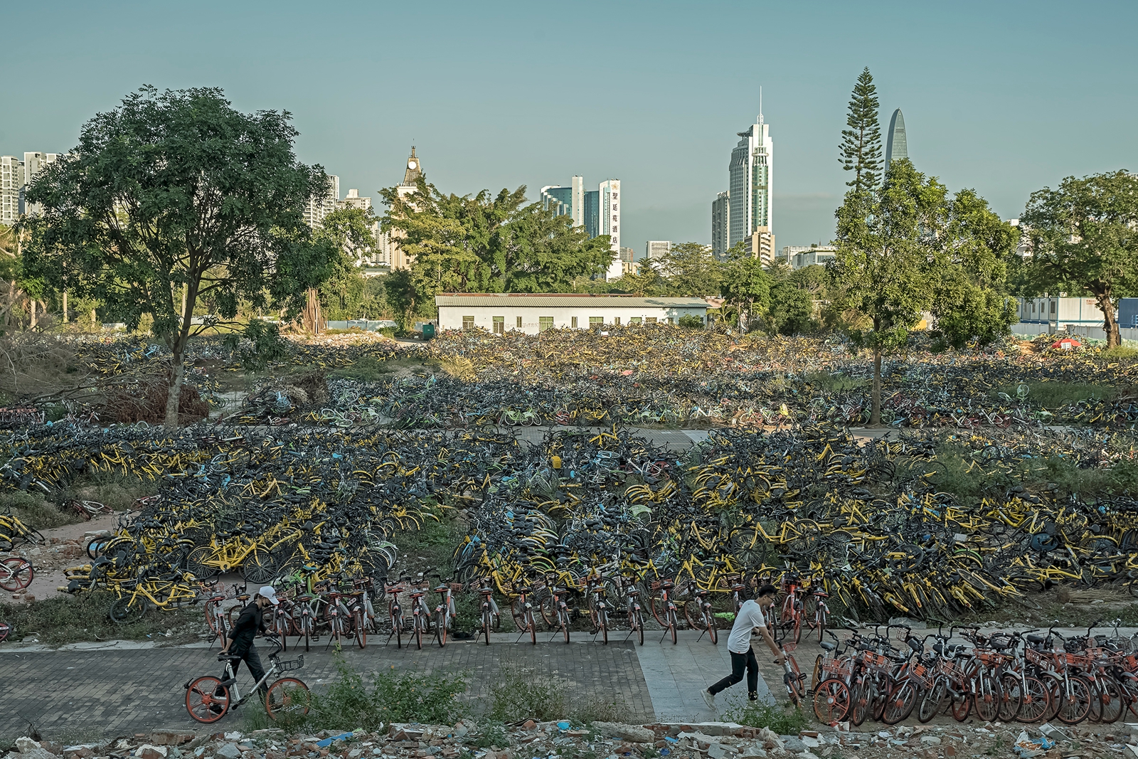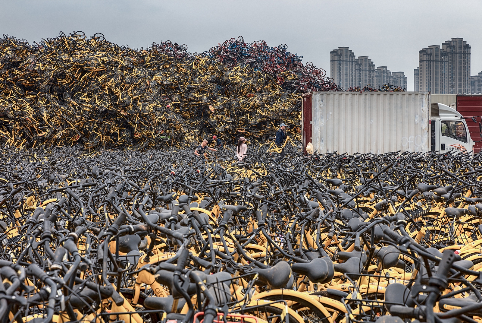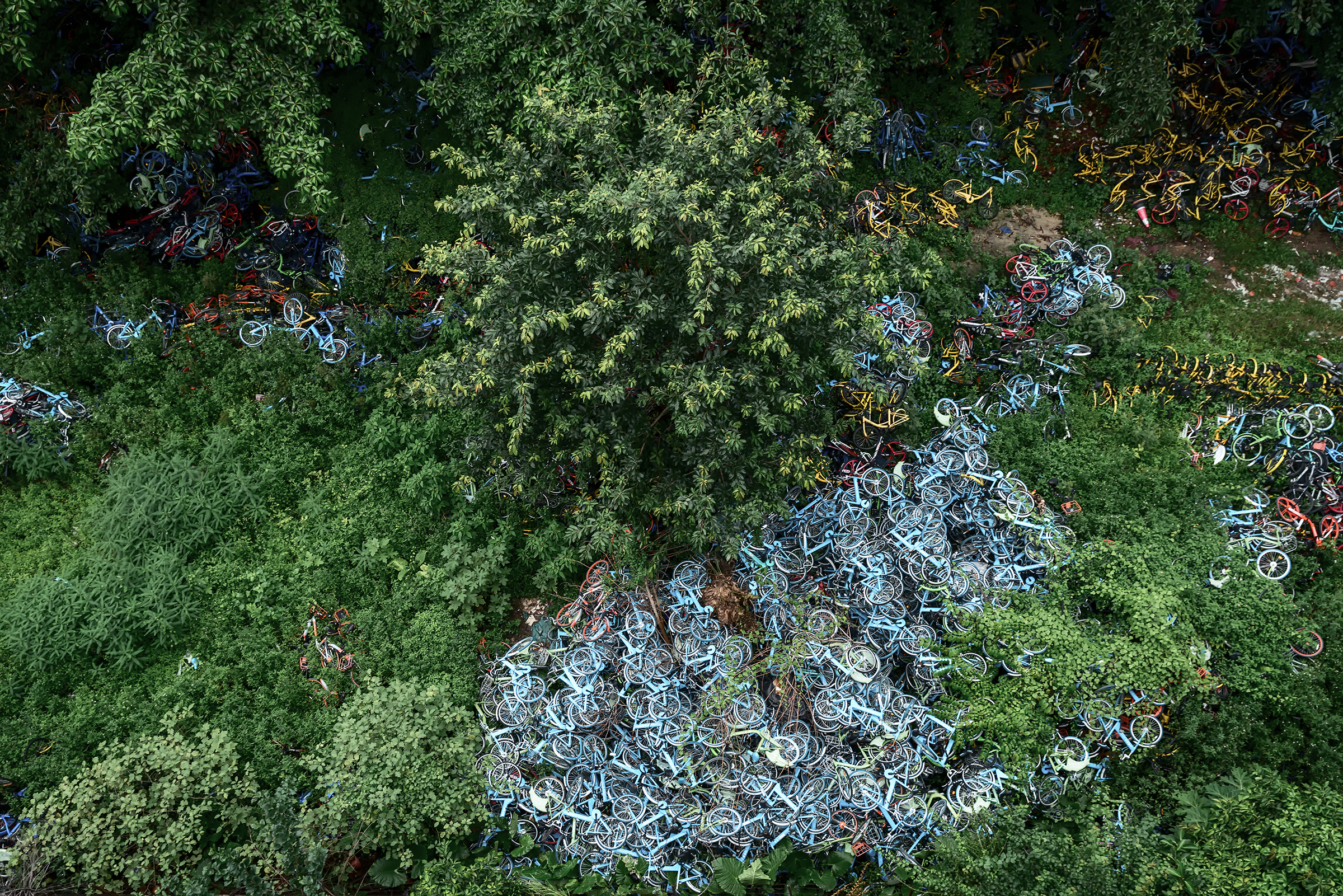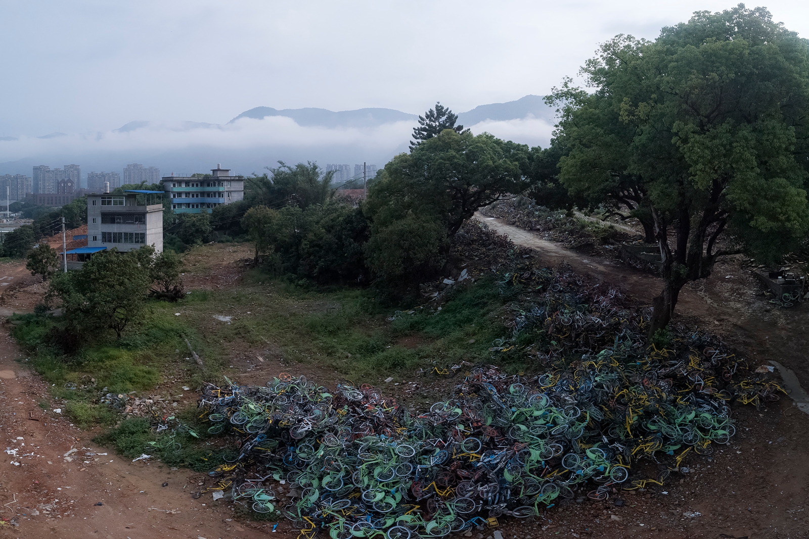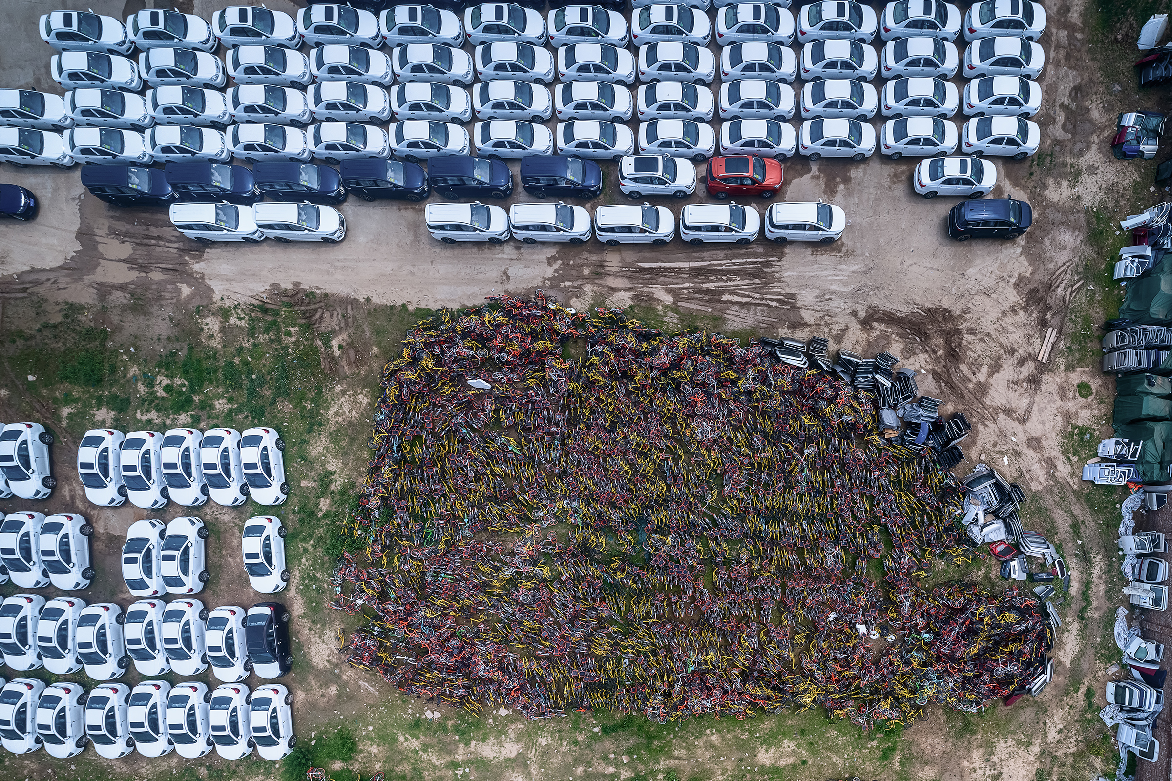 从一开始的放任不管,到2017年中期车多为患时,政府才觉不妙,开始实施限制管理,并由政府主导对市场上超量投放的单车进行收缴清理。这些被清理的临时堆车点在中国各大城市纷纷出现,体量庞大却又隐蔽难寻,被人们称为共享单车“坟场”。共享单车运营商因此纷纷倒闭,仅剩少数几家公司勉力运营。数十亿元人民币的用户押金无法退还,数百亿资本财富打造的共享单车弃如敝履,成了城市垃圾。