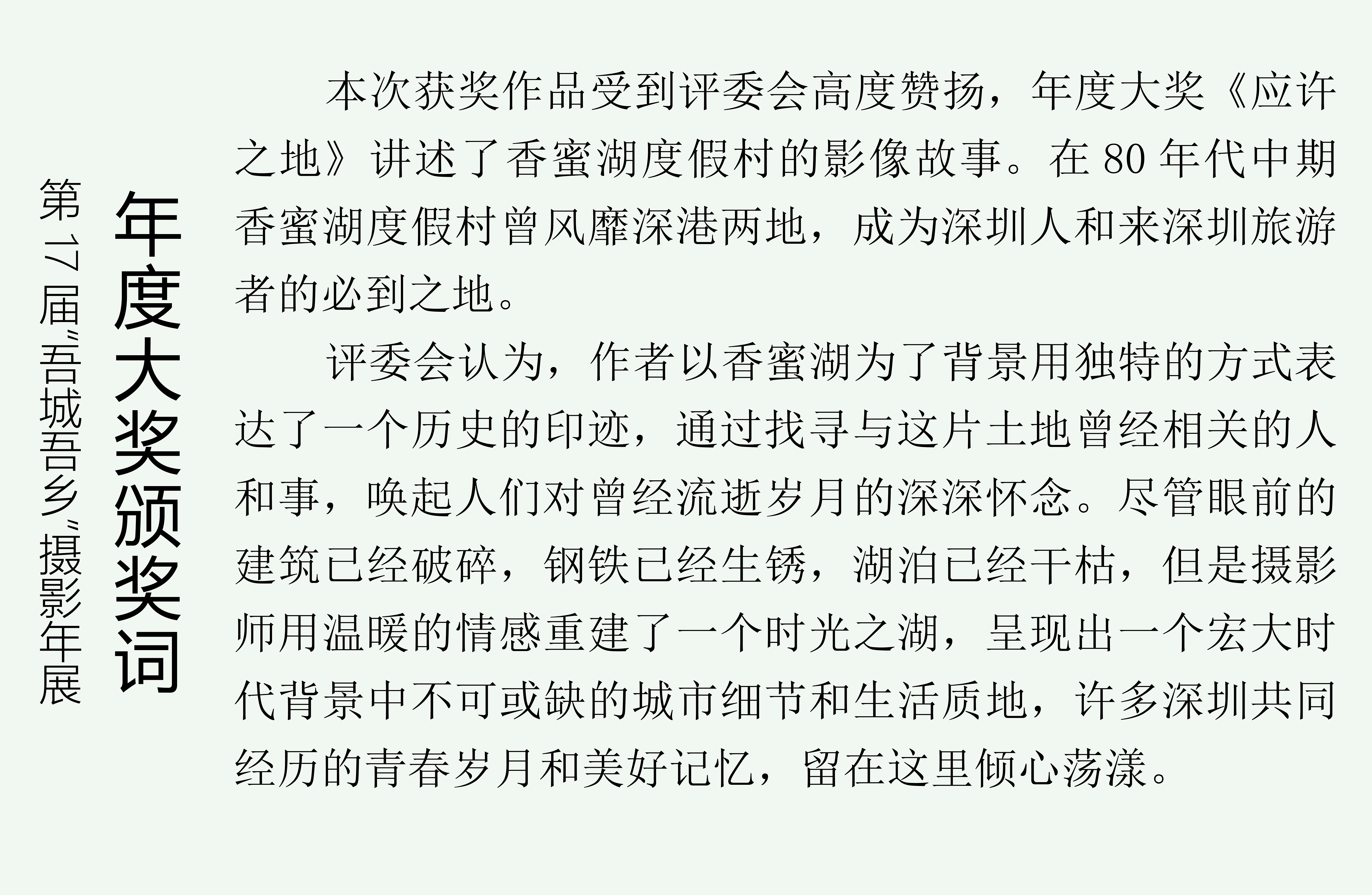 “应许之地”是人类自古以来对美好家园的想象所在。香蜜湖以及香蜜湖所代表的深圳,正是中国人通过改革开放所寻找到的,一块流着奶淌着蜜的“应许之地”。